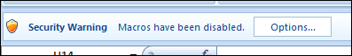 - Secara default, Excel 2007 akan menonaktifkan perintah VBA / Macro pada workbook yang kita buka. Terlihat pada security warning yang muncul pada bar bagian atasworksheet (gambar).